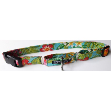 Our hand-selected cotton fabric cover helps keep pet fur from matting and provides a unique Hawaiian touch.  The high-tensile strength webbing forms a strong inner core for both the collars and leads.  The heavy-duty curved buckles and slide make the collars fully adjustable and more contoured for your dog's comfort.  The thick, Solid-Cast Nickel Plated metal D-rings on the collars and heavy-duty bolt snap-locks on the leads ensure a secure collar-lead connection.