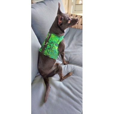 Our Custom-made Comfy harnesses: Our nylon webbing enforced "soft padded vest style" design makes it soooo comfortable for your furry friend and slightly adjustable velcro straps makes them easy to put on and take off.....the vest style shows much more of the fabric pattern than just webbing styles and provides your pet with a warmer, hugging feel.....NOTE: Although the velcro connectors are really strong, we only recommended for use with medium to small pets that don't lunge.....